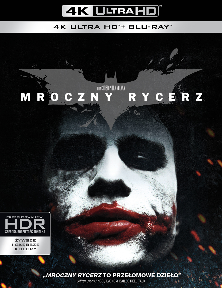 | Batman: Mroczny rycerz, w najlepszej rozdzielczości 4K UHD! Po filmie Batman Początek, Mroczny Rycerz ponownie zjednoczył reżysera Christophera Nolana i Christiana Bale'a, który po raz kolejny wcielił się w rolę Batmana/Bruce'a Wayne'a kontynuującego walkę z przestępczością. Heath Ledger zagrał postać arcyzłoczyńcy Jokera, Aaron Eckhart zaś Denta. Powrócił również Gary Oldman jako Gordon, Michael Caine jako Alfred i Morgan Freeman jako Lucius Fox. Wspaniała realizacja i efekty specjalne. | |