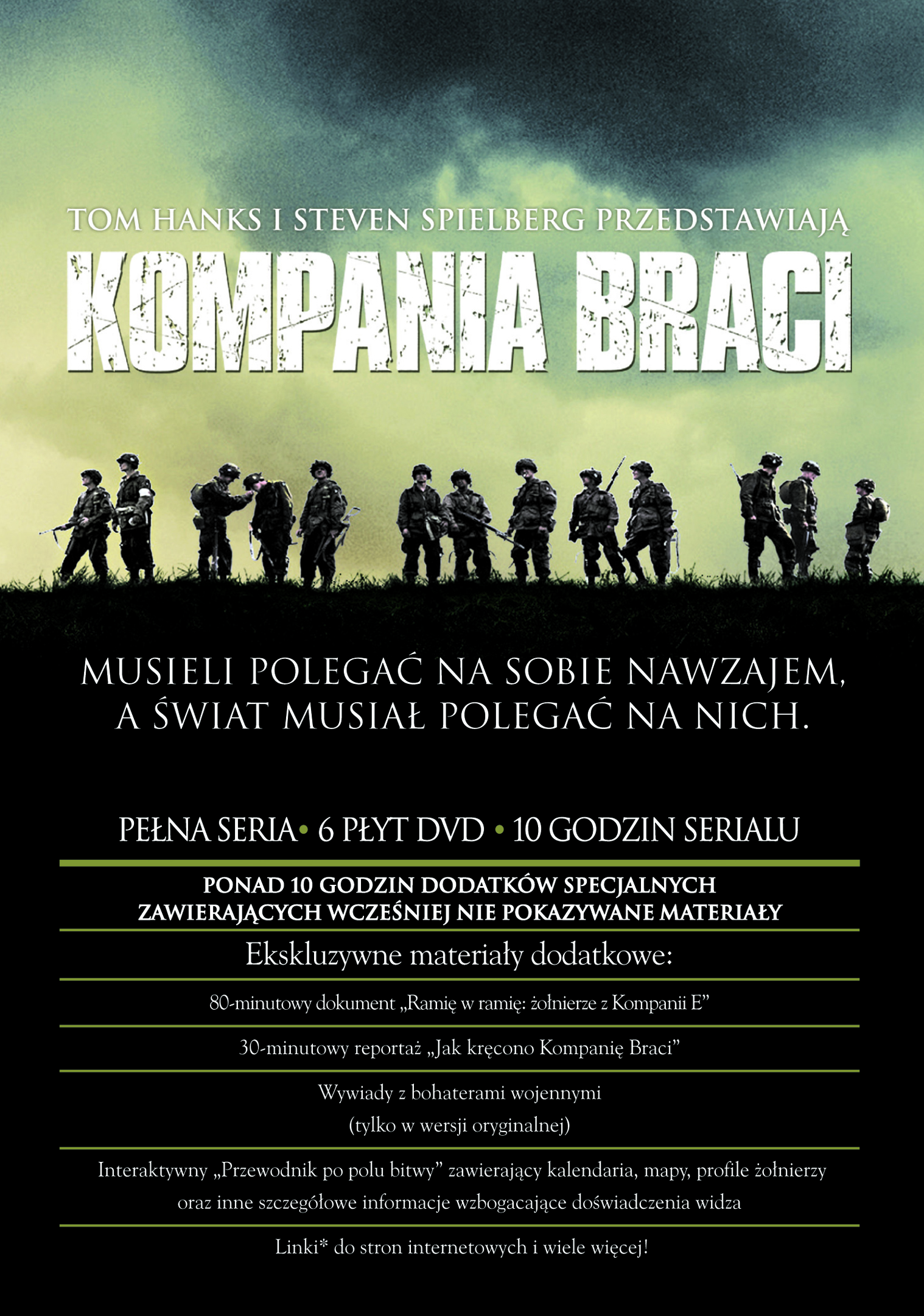 | Zrealizowany na podstawie bestsellerowej powieści Stephena E. Ambrose`a serial TV Kompania braci opowiada historię Kompanii E 506 pułku piechoty spadochronowej 101 Dywizji Powietrznodesantowej Armii Stanów Zjednoczonych. Fabuła została oparta na wywiadach z ocalałymi żołnierzami Kompanii E, a także ich dziennikach i listach, Kompania braci relacjonuje losy ludzi, którzy wykazali się niezwykłą odwagą i pokonali wielki strach. Służyli w elitarnej kompanii strzelców. Wraz z aliantami wylądowali w Normandii, walczyli w bitwie o Ardeny i zdobyli Orle Gniazdo Hitlera w Berchtesgaden. Ich oddział poniósł ciężkie straty, a oni sami stali się legendą. | |